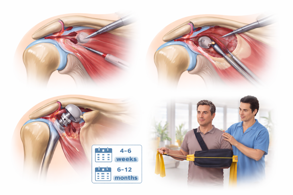 The recovery process depends on the type of surgery performed. For arthroscopic surgery, patients can expect a faster recovery of about 4-6 weeks, with physical therapy beginning shortly after. For open surgery, recovery may take 6-12 months, with a significant focus on rehabilitation to restore shoulder strength and function.
